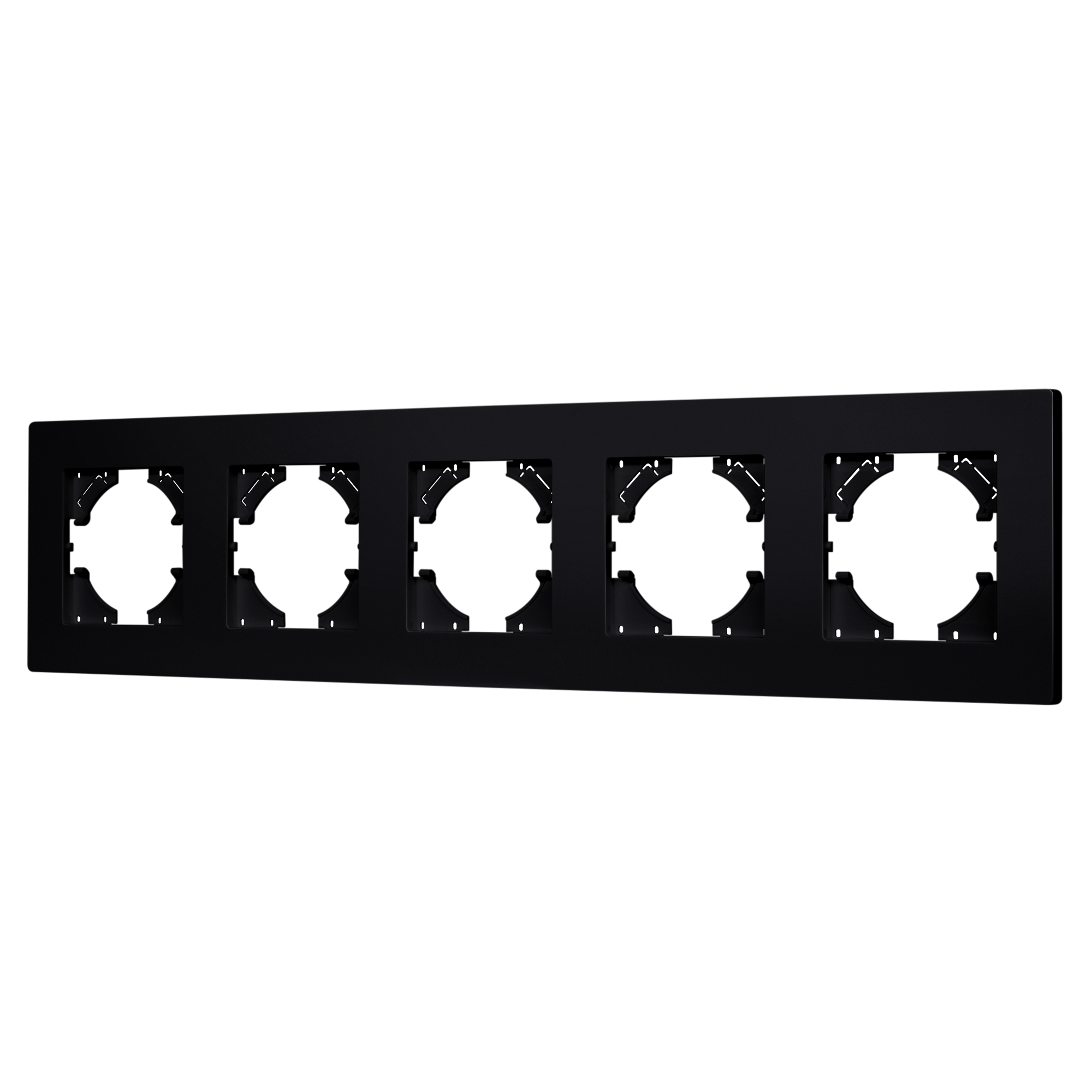Рамка пластиковая на 5 постов, под встраиваемый механизм. Цвет - черный. Среднего уровня герметичности IP20. Ориентация монтажа - горизонтальная (основным ориентиром служат посадочные выступы для накладки механизма).