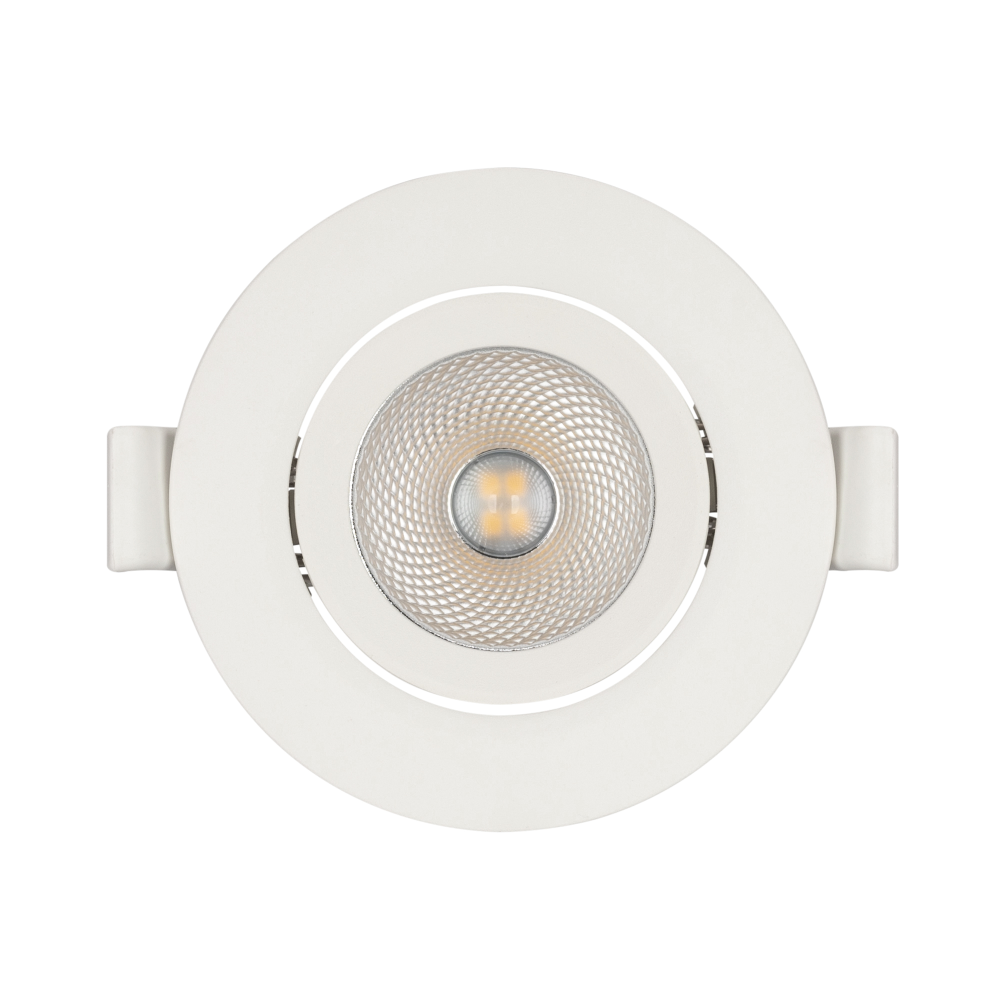 Встраиваемый поворотный светильник "даунлайт". Мощность 4.5 Вт, св. поток 400 лм, 89 лм/Вт, дневной 4000 K, CRI>80, UGR<19, угол 36°, напряжение питания 230 В. Белый круглый корпус из теплопроводящего полиамида, экран пластик, степень защиты IP20, угол поворота оси 30°. Размер: диаметр 80 мм, высота 37.5 мм. Монтаж встраиваемый, установочное отверстие диаметр 60-70 мм. Пульсация <2%.
